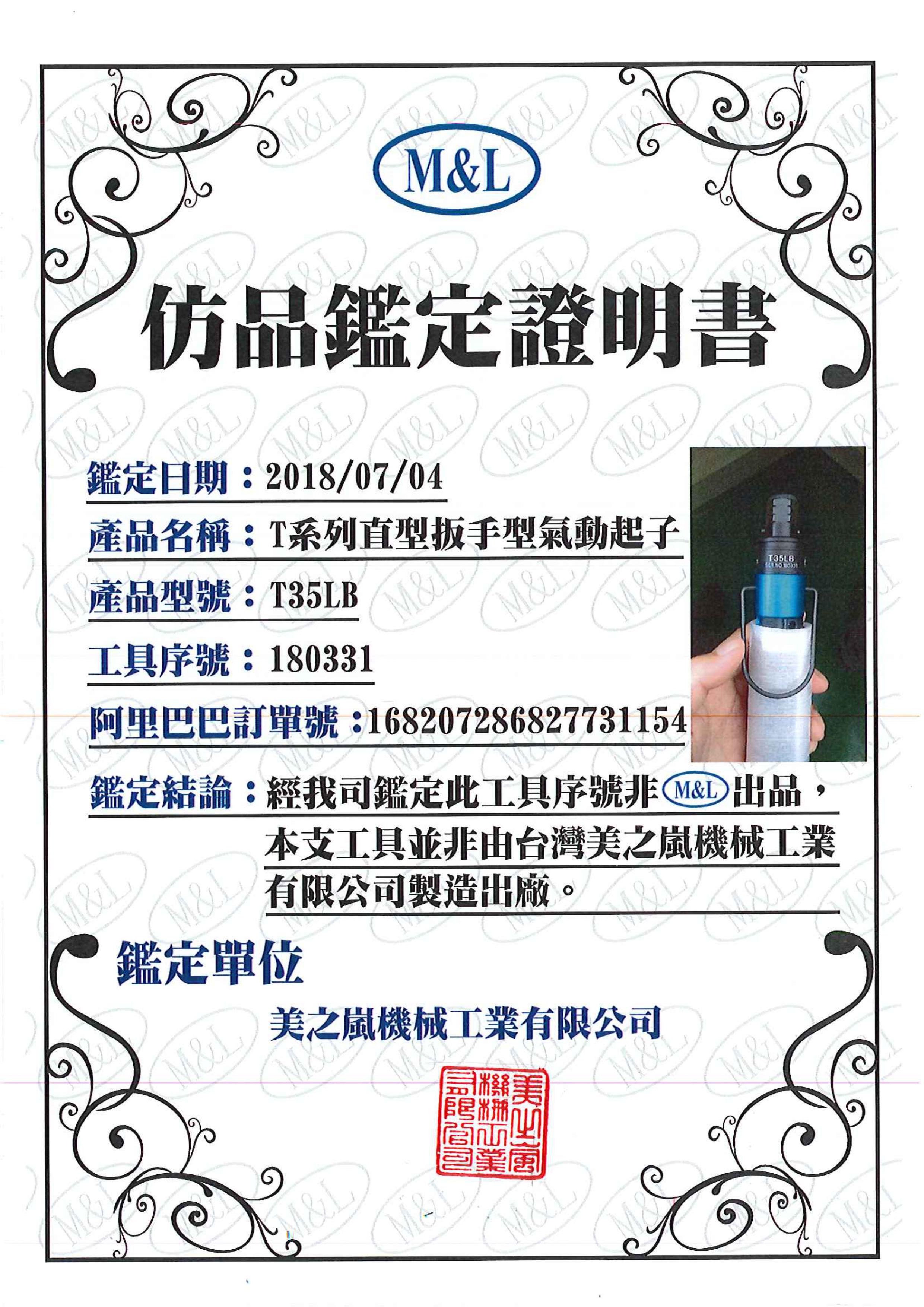最近M&L 美之岚机械工业有限公司收到客人来信鉴定从大陆当地购买的T-LB工具,客户告知贩售此支工具的公司说为原厂正品出货,但经我司鉴定客户提供的此工具序号非M&L出品,本支工具并非由台湾美之岚机械工业有限公司制造出厂。【附图为M&L提供的仿品鉴定证明书】